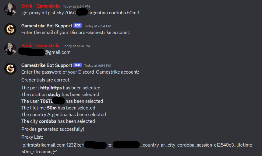 If you entered everything correctly then it will ask you to enter your Discord-Gamestrike account details and if you did it right it will then give you the proxy list. The command will then look something like the following for a sticky proxy: